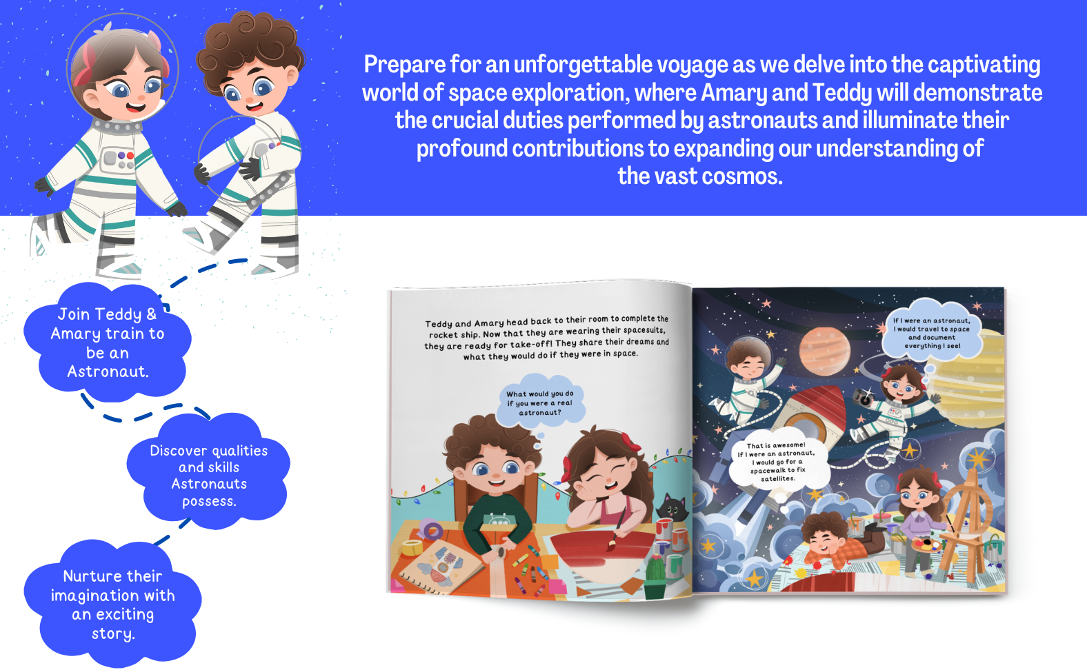 Does your kid dream of exploring space and becoming an astronaut? Inspire your little one with this exciting career exploration book, written and beautifully illustrated for young readers. Join Amary and Teddy on their journey of becoming astronauts and discover the skills and characteristics that make them space explorers.