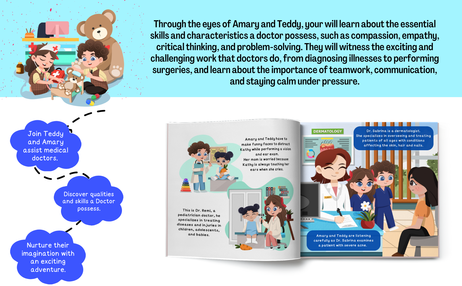 Through the eyes of Amary and Teddy, your child will learn about the essential characteristics and skills that doctors possess, such as compassion, empathy, critical thinking, and problem-solving. As they assist various medical professionals in the hospital, Amary and Teddy demonstrate the importance of teamwork, communication, and staying calm under pressure.