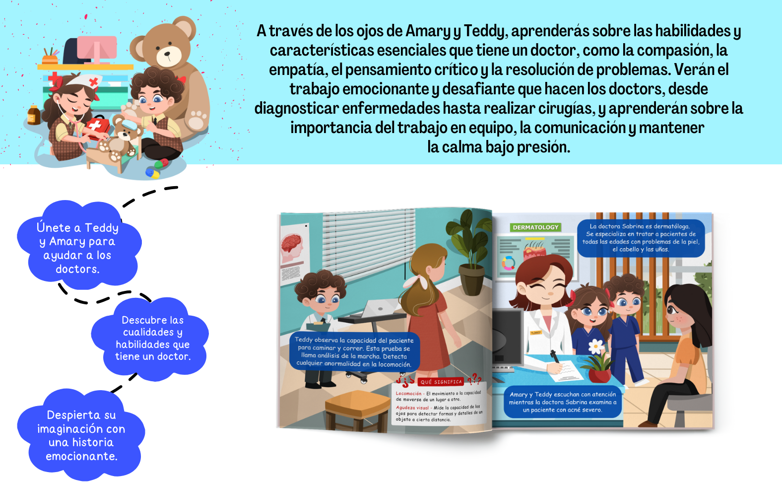 A través de los ojos de Amary y Teddy, tu pequeño descubrirá las cualidades esenciales de los doctores, como la compasión, el pensamiento crítico y el trabajo en equipo. Mientras ayudan a otros doctores en el hospital, Amary y Teddy muestran lo importante que es trabajar juntos y mantener la calma bajo presión.